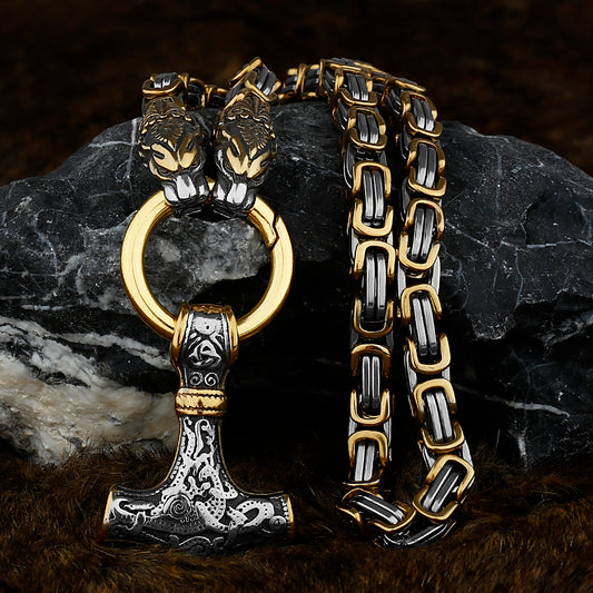 Wolf’s Head Thor’s Hammer Viking Mjolnir Necklace King's Chain - Gold & Steel